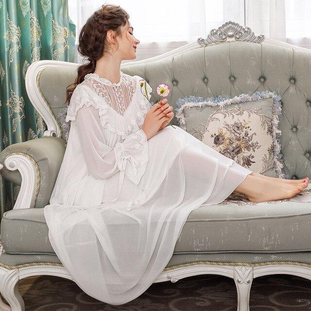 2019 New Spring Autumn Princess Nightdress Women's Long Nightgown Mesh Lace Sleepwear Long Sleeves Ladies Nightshirt Pyjamas