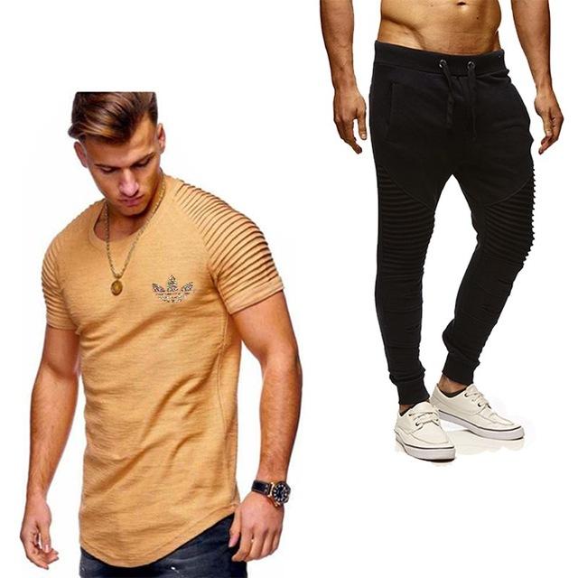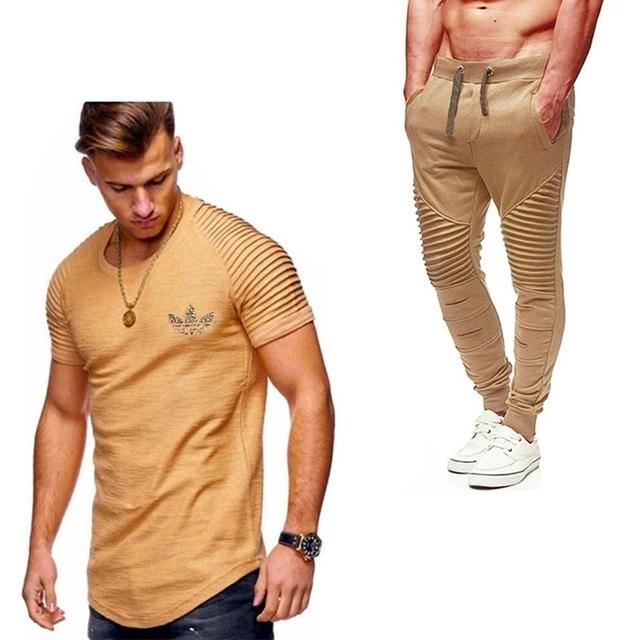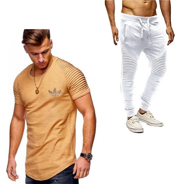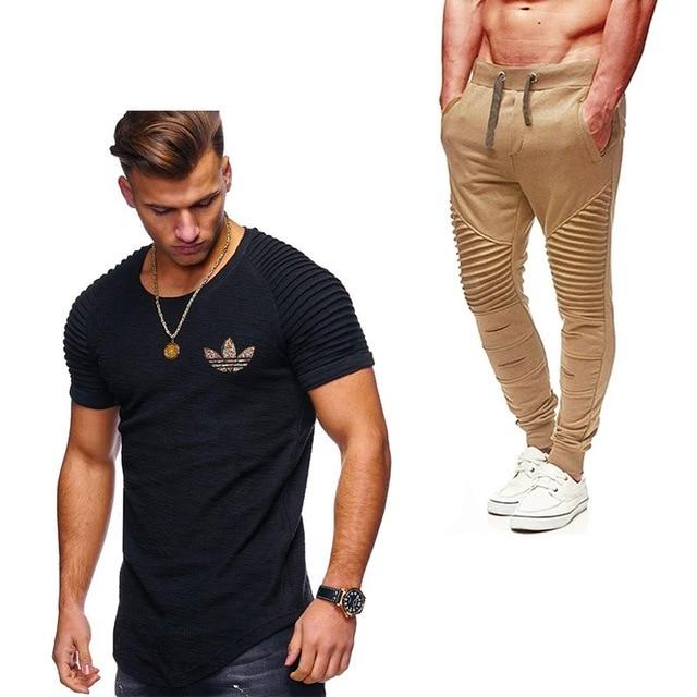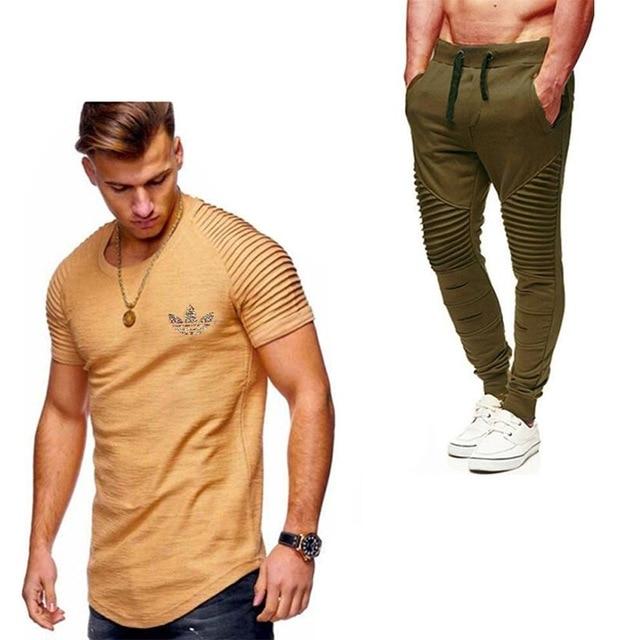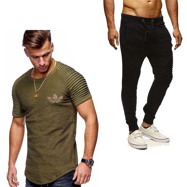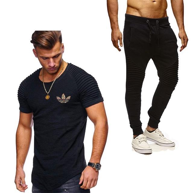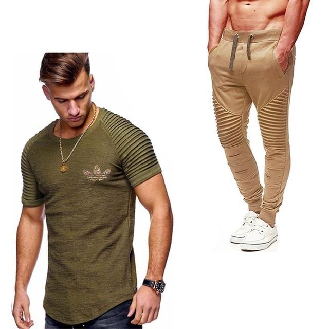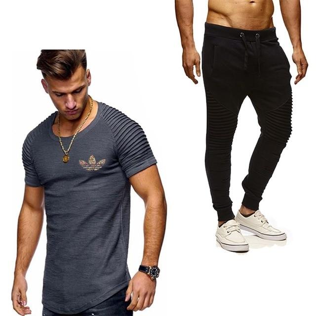 2019 Summer Men pleated T Shirts+pants Sets Tide brand Hot Sale Cotton Comfortable Short Sleeve Tshirt men Casual Set Pant