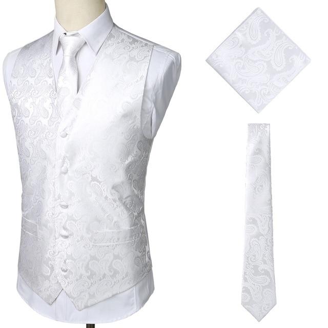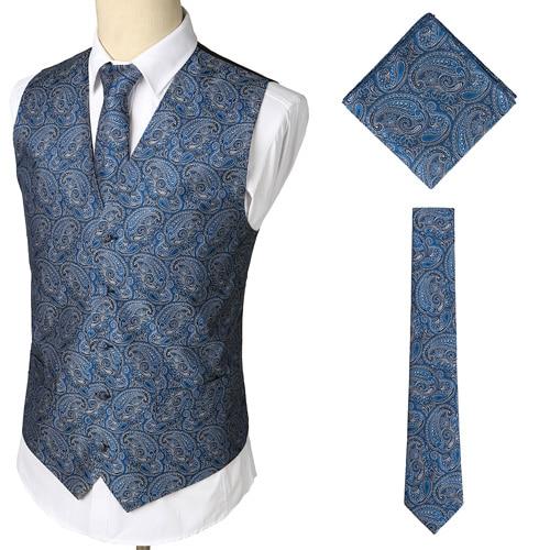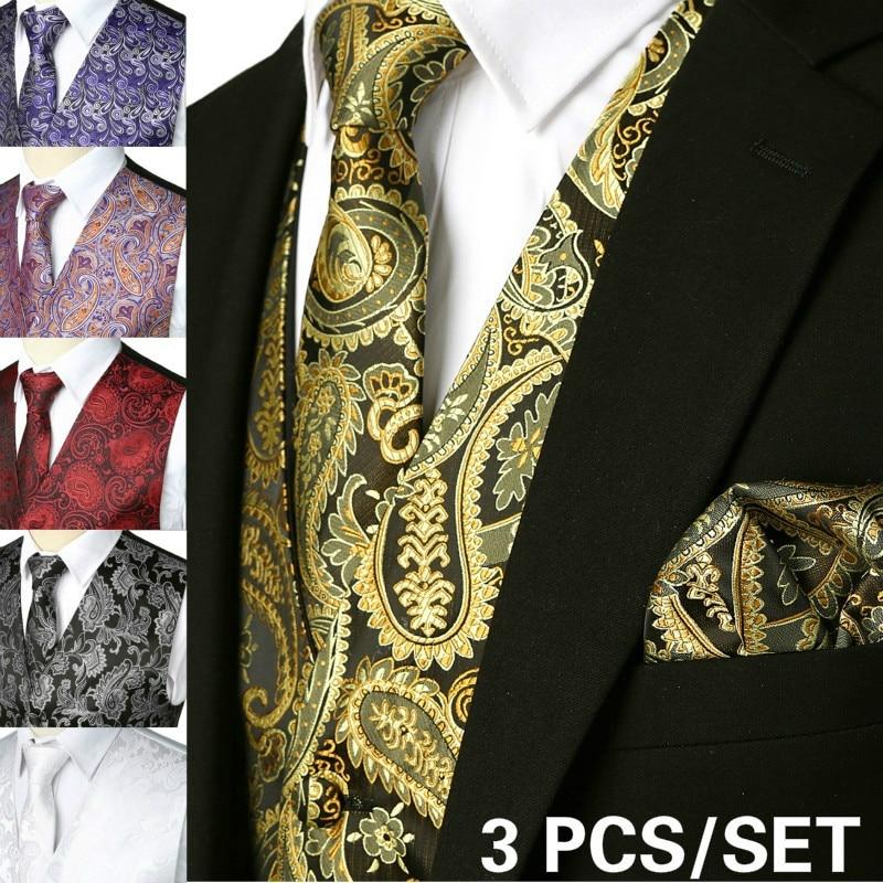 Brand Gold Mens Suit Vest+Tie+Pocket Square 3pcs Set Paisley Floral Sleeveless Wedding Waistcoat Men Party Club Prom Gilet Homme