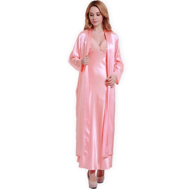 Fashion New Silk Robes + Nightdress Two-Piece Women Sleepwear Sexy Lace V-Neck Sleeping Robe Long-Sleeve Nightgowns FW001