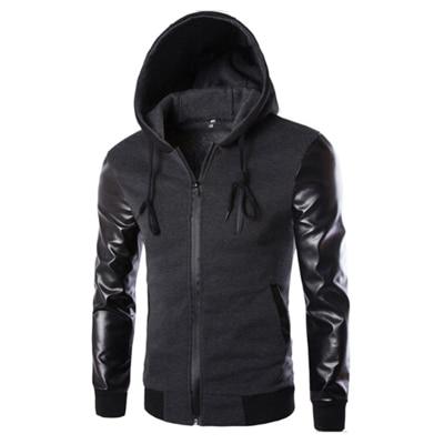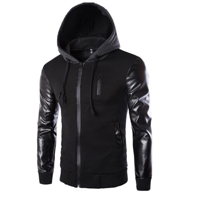 High Quality New Men Hooded Jacket And Coat Autumn Casual PU Leather Sleeve Slim Outerwear Coat Men Zipper Coat Hoody Sportswear