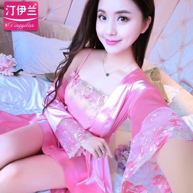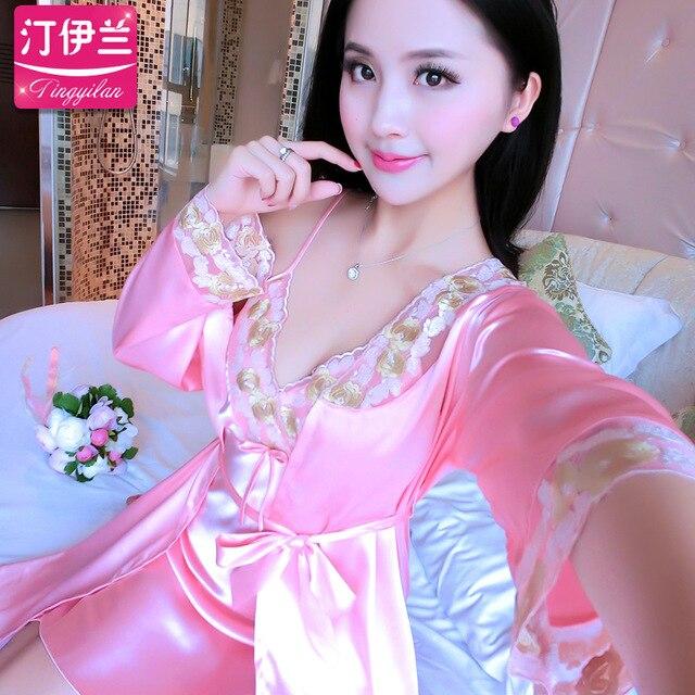 Lady Pajamas 2pcs Women Summer Sexy Sleepwear Girls Long Sleeve Nightdress Silk Suspender Nightgown Ice Silk Homewear B-6652