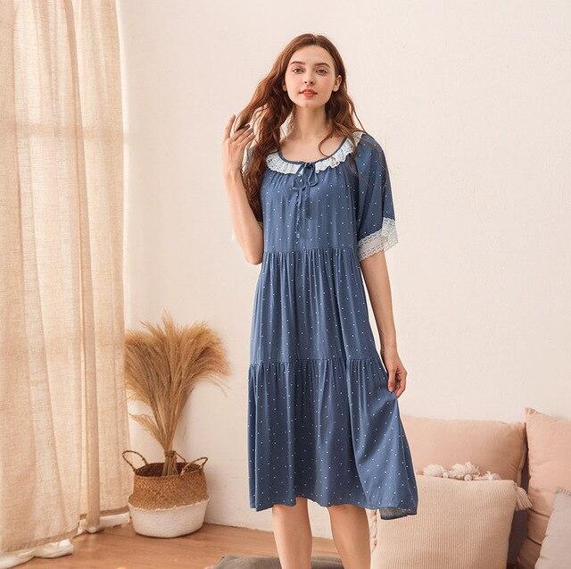 Summer New Short-sleeved Cotton Long Sleepwear Korean Fresh Lace Printing Night Dress Women Plus Size Nightgowns Lingerie Dress